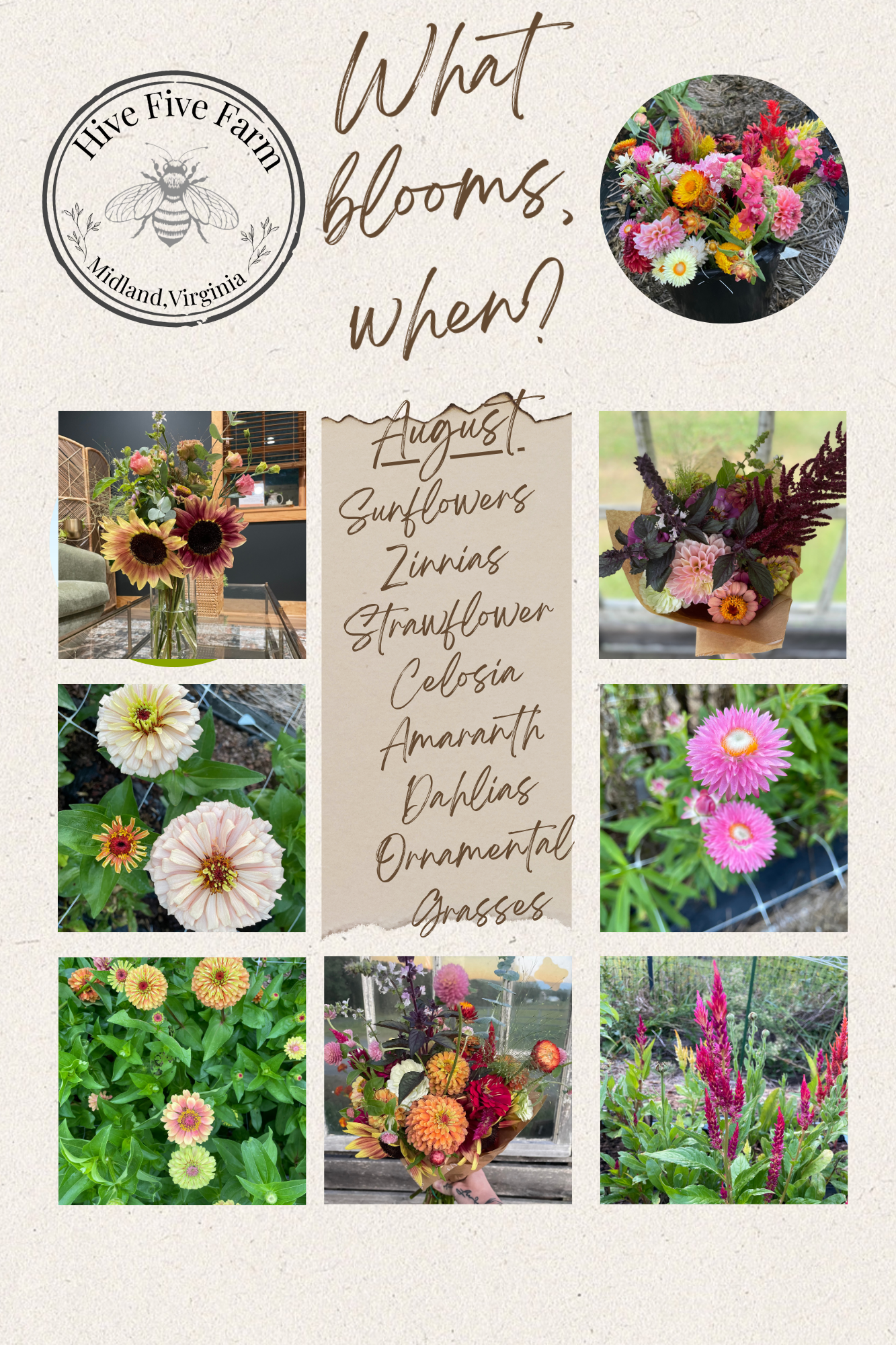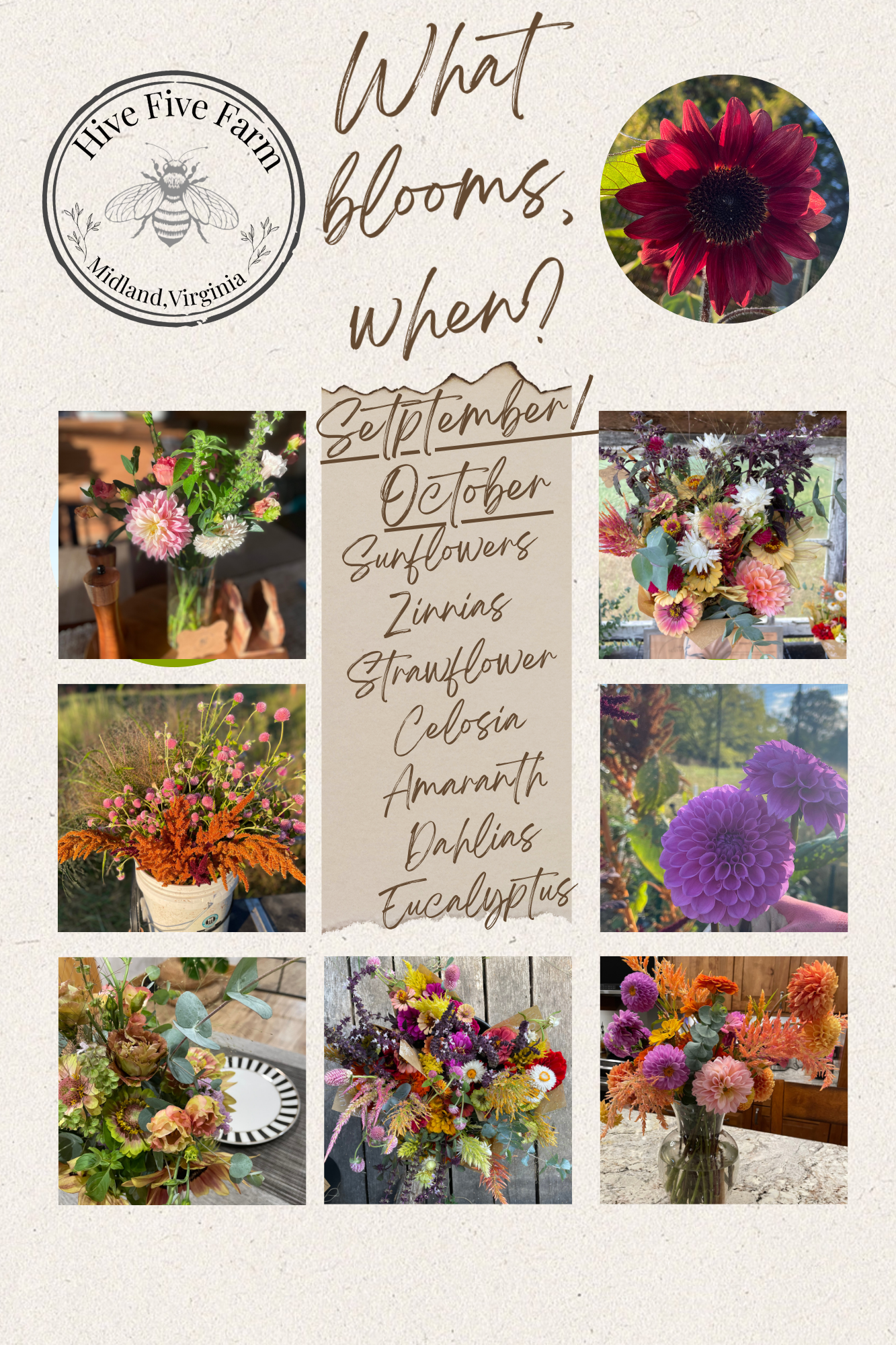 Late-season blooms thrive in heat and long days. Sunflowers reach their full stride, alongside zinnias, dahlias, eucalyptus, amaranth, celosia, basil, mountain mint, and ornamental grasses. These flowers are bold, abundant, and dramatic, reflecting the fullness of late summer and early fall.