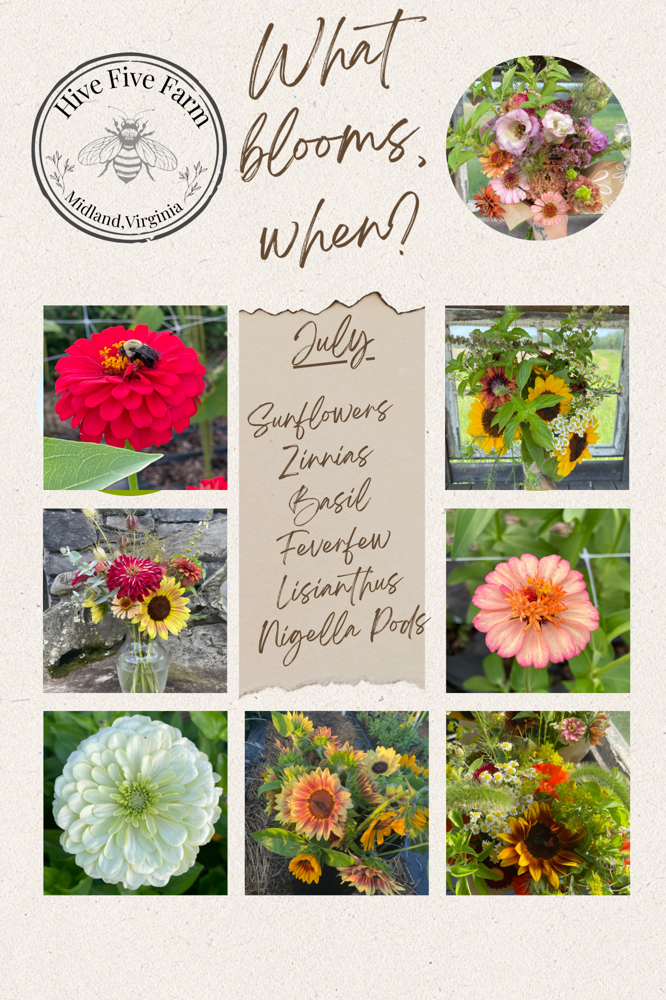 Mid-season flowers arrive as the days grow longer and the soil warms. Early sunflower varieties continue, joined by feverfew, yarrow, lisianthus, bupleurum, basil, and early zinnias. This is when bouquets start to feel fuller and more layered, with stronger stems and richer textures.