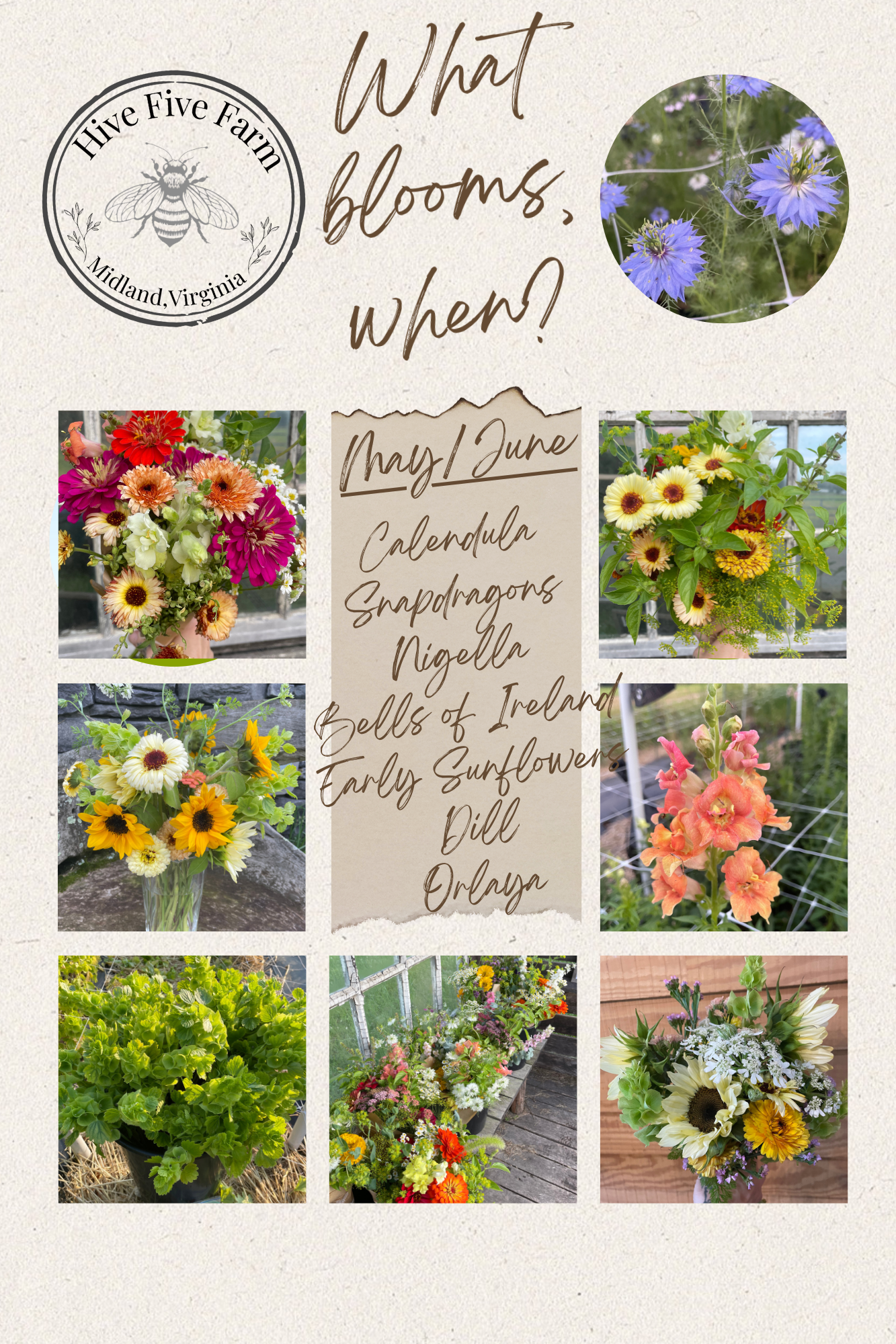 To help you follow along more easily, I’ve created a colorful bloom-time guide that shows when different flowers typically appear throughout the season, paired with real photos from the farm. This guide is meant to be both informative and reassuring. A reminder that if something isn’t blooming yet, it’s not late. It’s simply not time.